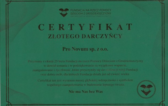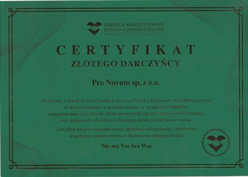 Pro Novum w 2025 r aktywnie realizowało założenia społecznej odpowiedzialności biznesu, angażując się w działania na rzecz osób potrzebujących oraz wspierając inicjatywy społeczne i edukacyjne. Nasze działania koncentrowały się na niesieniu pomocy osobom chorym, niepełnosprawnym oraz znajdującym się w trudnej sytuacji życiowej poprzez przekazywanie darowizn finansowych.
